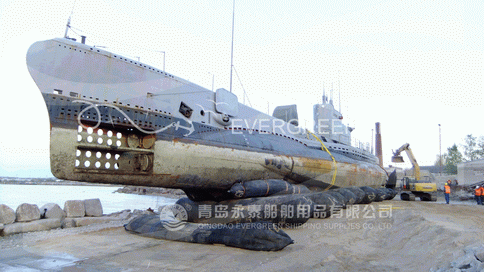 该潜艇进馆计划包括潜艇上岸,陆地运输600米,转向90度,最终进入博物馆,全部由永泰气囊来完成。由于工期较短,临时上排坡道仅由简单的石块铺就而成,加上潜艇的圆形壳体,与气囊接触面积小,因此对气囊的提出很高的要求。永泰气囊凭借6倍安全系数的过硬质量得到了爱沙尼亚政府的认可。